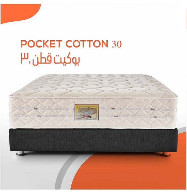 تحتوى المرتبه بوكيت قطن على السوست المنفصله التى تعطى الجسم الراحه والجوده العاليه كما تحتوى على طبقه الاسفنج التى تساعدالراحه وطبقه القطن التى تساعد على النعومه لنوم عميق واحلام سعيده. هى عباره عن شاسيه من السوست منفصله المصنوعه من الصلب المقوى ليضمن عدم حدوث اى هبوط فى المرتبه باالضافه انها معالجه ضد الصدأ باالضافه الى السلك الذى يربط السوست ببعضها بطريقه معينه بحيث يضمن عدم خروج السوست خارج الشاسيه وعدد السوست 255سوست فى المترالمربع طبقه اللباد قطن مضغوط حراريا يعمل كعازل بين السوست وطبقات االسفنج حتى اليحدث احتكاك بين السوست والطبقات التى فوقها ويعطى صالبه للمرتبه ويعزل صوت السوست. طبقه اسفنج 1.5سم كثافه 20+طبقه فايبر 200جرام طبقه اسفنج يانسن 4.5 سم كثافه 30 وجه طبقه قطن من كل وجه اسفنج1سم كثافه 20+فازلين 20 جرام قماش دبل نت المعالج ضد البكتريا وحشرات الفراش فتحات التهويه موجوده على جانبى المرتبه وزعت بطريقه مدروسه لضمان التهويه الجيده والكامله داخل المرتبه مما اليدع اى مجال لروائح كريهه او تعفن داخل المرتبة