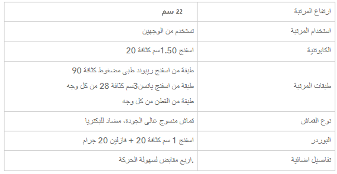 هى نوع مختلف من المراتب لمن يعاني من ألام في الظهر و الرقبة ، ماريوت مزيج من السفنج العالي الكثافة ( الطبي ) و طبقه من القطن ، فهي تعطيك الثبات في النوم مع الدعم لفقرات الظهر هى عباره عن شاسيه من الاسفنج الطبى المضغوط ليضمن عدم حدوث اى هبوط فى المرتبه باالضافه انها معالجه ضد الصدأ طبقه من اسفنج ربيويد طبى مضغوط كما نحتوى على اسفنج يانسن وطبقه القطن التى تجعل المرتبه اكثر راحه طبقه اللباد قطن مضغوط حراريا يعمل كعازل بين طبقات الاسفنج وطبقات االسفنج طبقه اسفنج 1.5سم كثافه 20+طبقه طبقه اسفنج يانسن 4.5 كثافه 28 وجه طبقه قطن من كل وجه كما تحتوى على وجهين لراحه اكثر طبقه اسفنج ربيوند طبى مضغوط كثافه 90 اسفنج1سم كثافه 20+فازلين 20 جرام قماش دبل نت المعالج ضد البكتريا وحشرات الفراش فتحات التهويه موجوده على جانبى المرتبه وزعت بطريقه مدروسه لضمان التهويه الجيده والكامله داخل المرتبه مما اليدع اى مجال لروائح كريهه او تعفن داخل المرتبة.