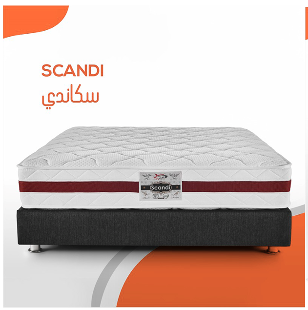 تحتوى المرتبه سكاندى على السوست المنفصله التى تعطى الجسم الراحه والجوده العاليه كما تحتوىعلى طبقه الاسفنج سوبر سوفت التى تساعدالراحه والنعومه لنوم عميق واحلام سعيده. هى عباره عن شاسيه من السوست منفصله المصنوعه من الصلب المقوى ليضمن عدم حدوث اى هبوط فى المرتبه باالضافه انها معالجه ضد الصدأ باالضافه الى السلك الذى يربط السوست ببعضها بطريقه معينه بحيث يضمن عدم خروج السوست خارج الشاسيه وعدد السوست 255سوست فى المترالمربع طبقه اللباد قطن مضغوط حراريا يعمل كعازل بين السوست وطبقات االسفنج حتى اليحدث احتكاك بين السوست والطبقات التى فوقها ويعطى صالبه للمرتبه ويعزل صوت السوست. طبقه اسفنج 1.5سم كثافه 20+طبقه فايبر 200جرام طبقه اسفنج يانسن3 سم كثافه 30 وجه طبقه قطن من كل وجه اسفنج1سم كثافه 20+فازلين 20 جرام كما تحتوى على وجهيبن لراحه اكثر قماش دبل نت المعالج ضد البكتريا وحشرات الفراش فتحات التهويه موجوده على جانبى المرتبه وزعت بطريقه مدروسه لضمان التهويه الجيده والكامله داخل المرتبه مما اليدع اى مجال لروائح كريهه او تعفن داخل المرتبة.